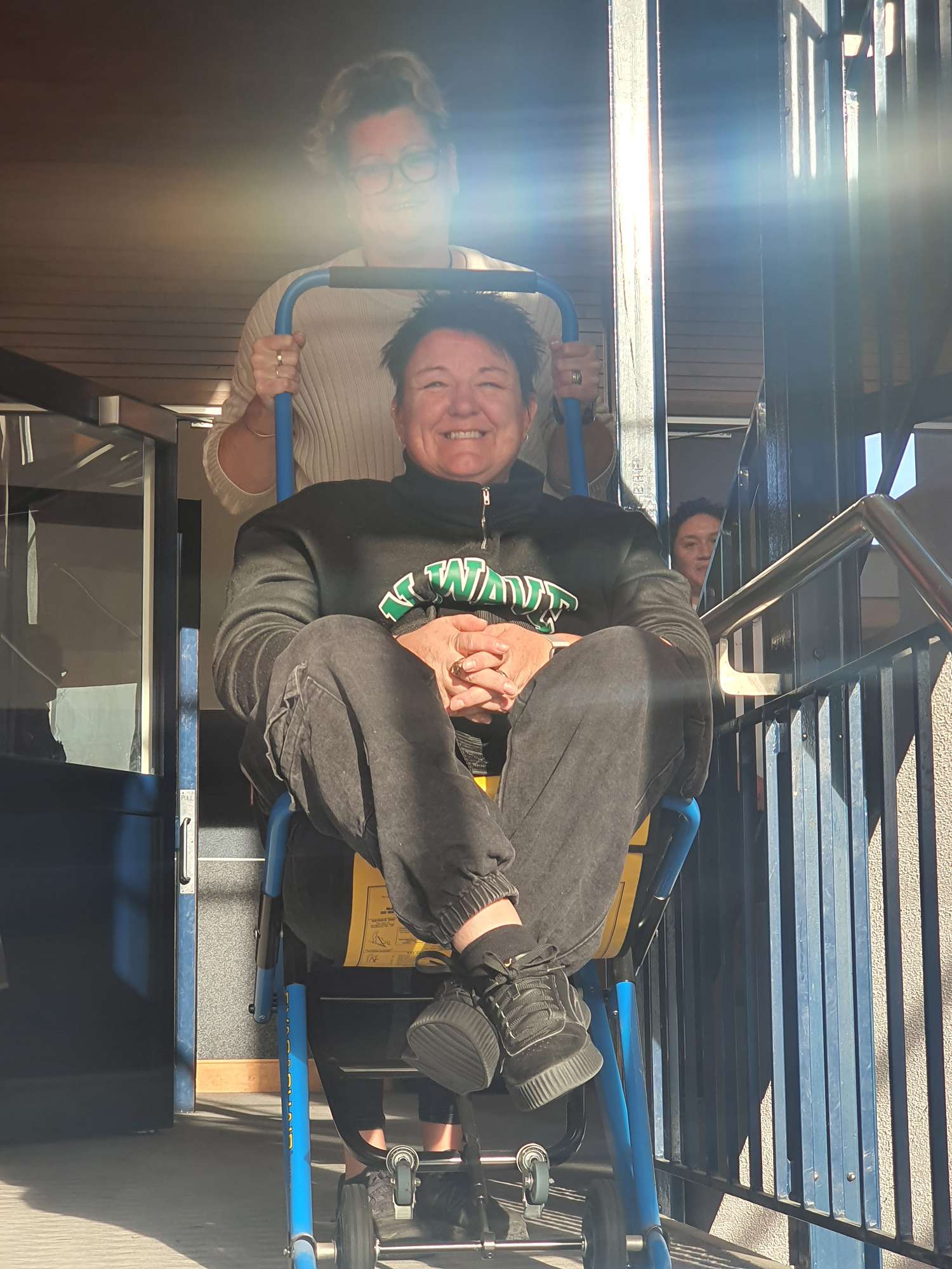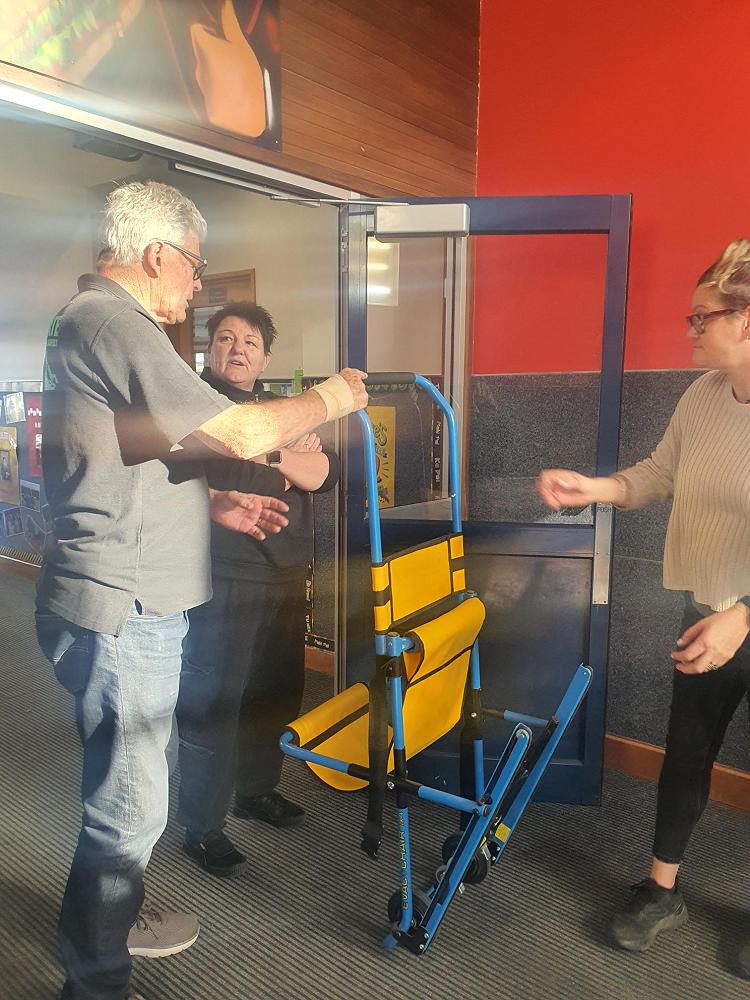 Here we have Hayley Stevenson and Wendy Blythe undergoing E-Vac training in order to move students on the stairwell in an emergency.