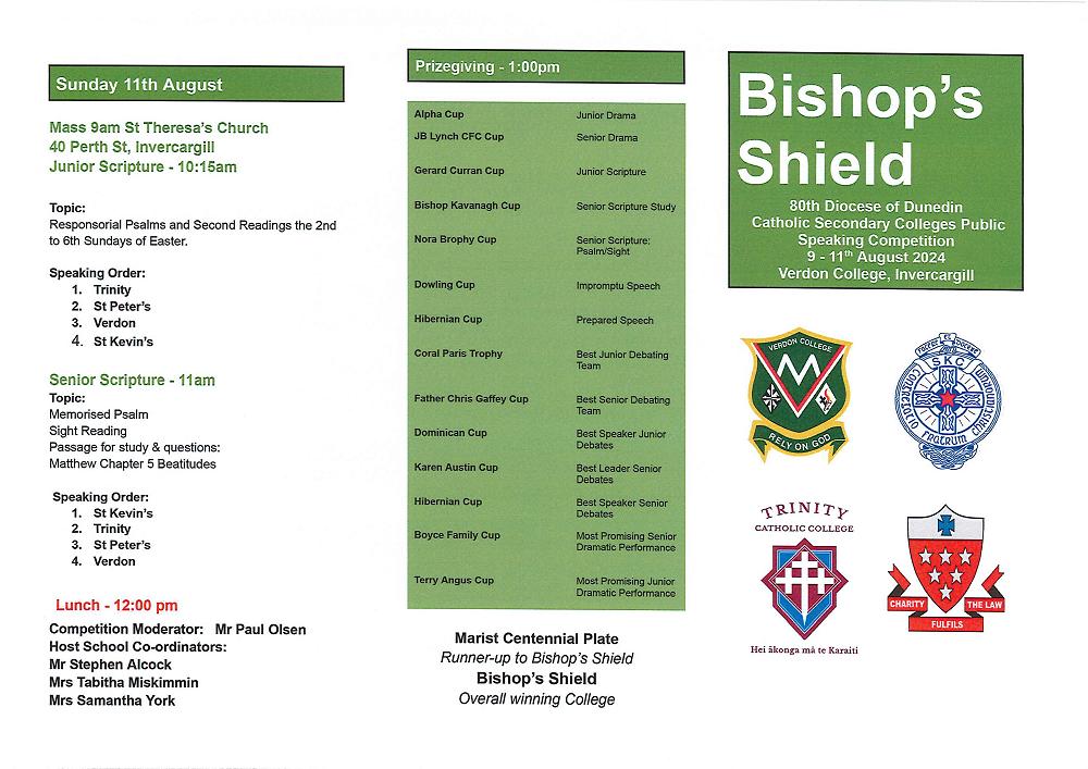 Our talented students are competing in the Bishop's Shield this weekend at Verdon College, Invercargill. The event starts today and runs through the weekend. Check out the programme and come along to show your support.