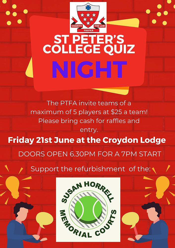 Please help us with raffle donations for the quiz. All proceeds go towards upgrading the Susan Horrell tennis courts, so please help out if you can. Please drop donations to the main office. All items accepted but here is a guide if you need ideas.