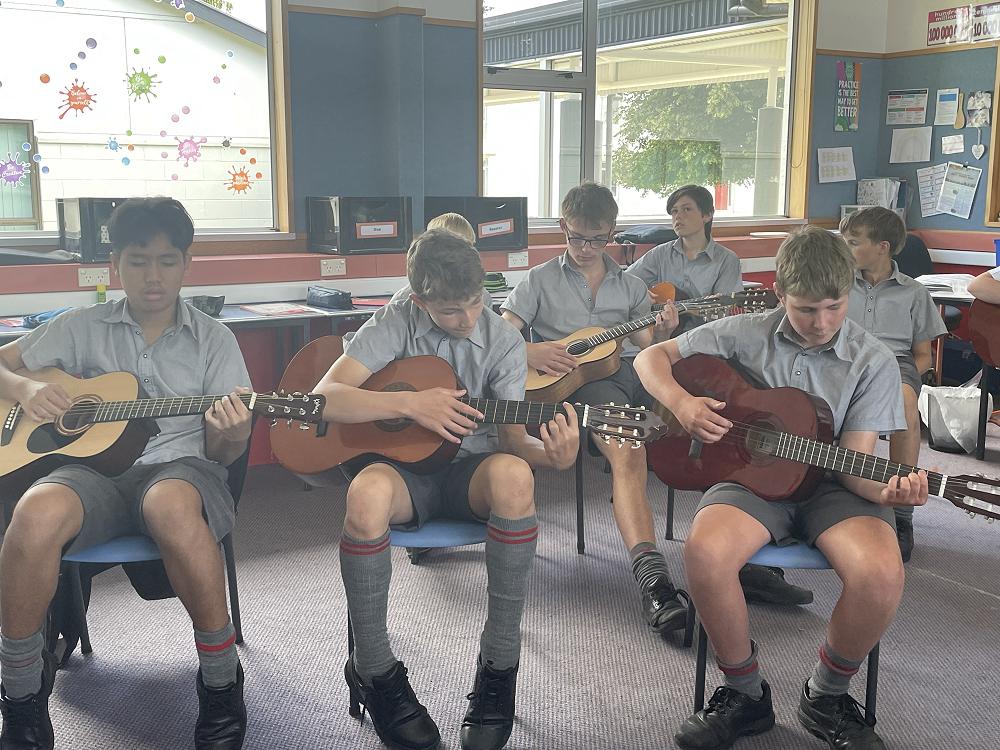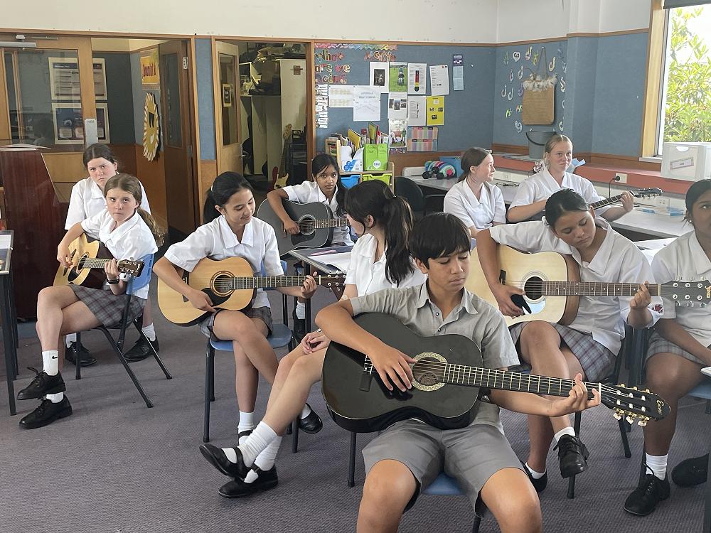 A week into music and 9P were well underway with learning the guitar. Here they are in a whole class lesson, playing "A Horse With No Name". Rock stars in the making!