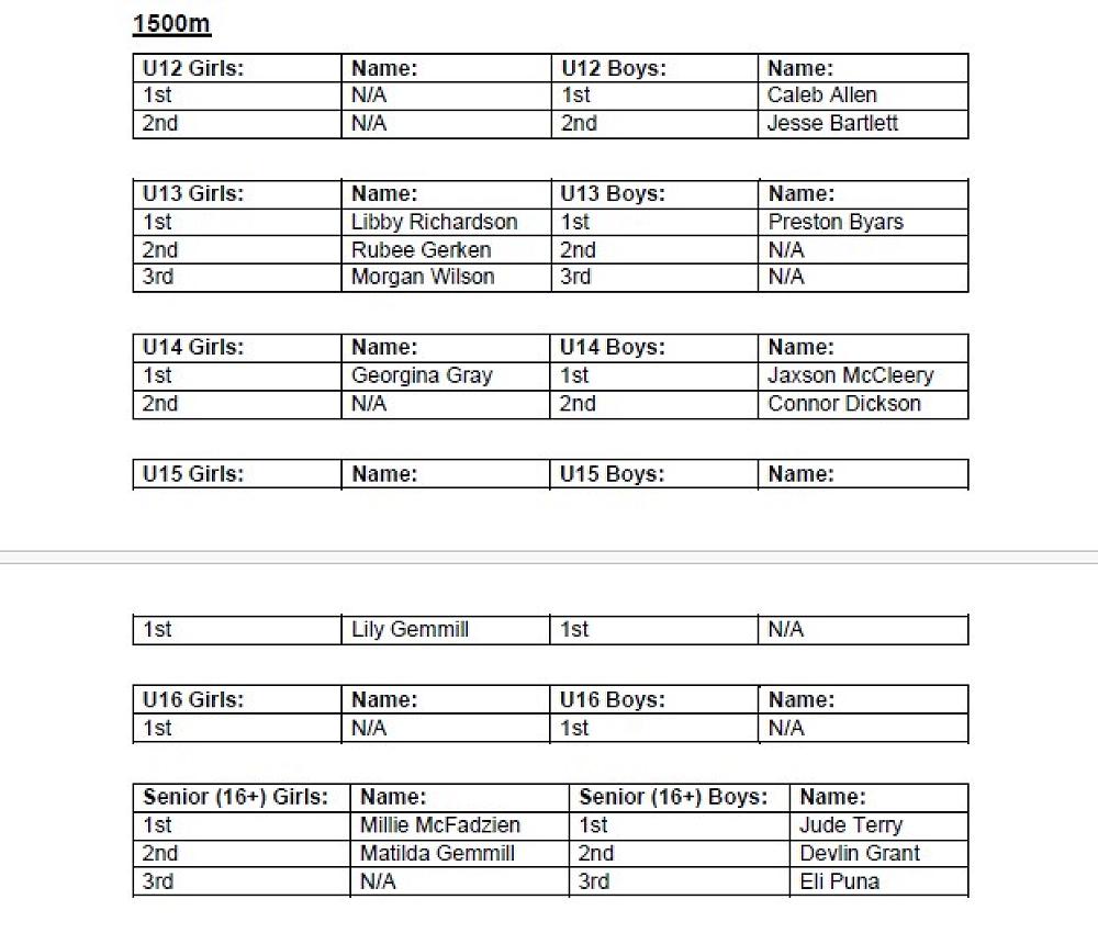 • Senior Girls 1500m Record of 5.04mins held by Millie McFadzien (2025) broken by Millie McFadzien, running it in 4.59mins.