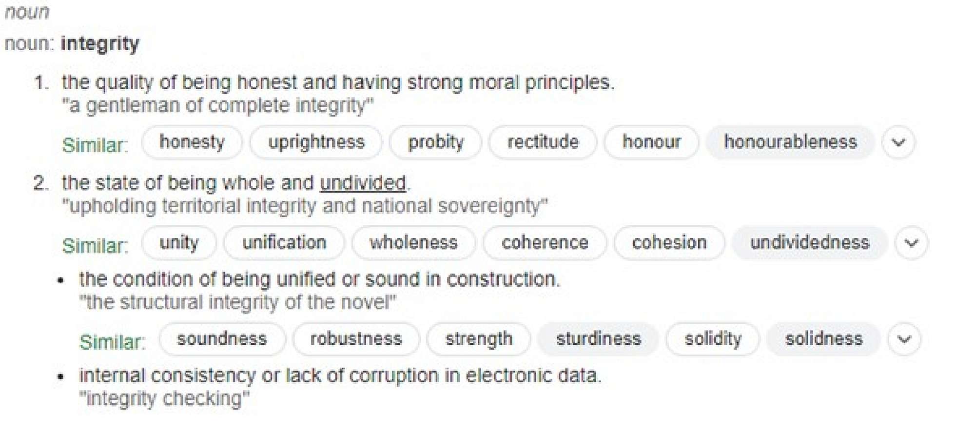 The word “integrity” does of course have many different meanings too. It was with this in mind that all of our new Year 11 courses have been created based on this concept, the concept of “integrity”. This snip of a Google search might help explain this.