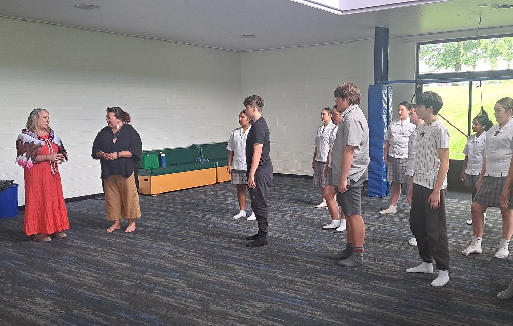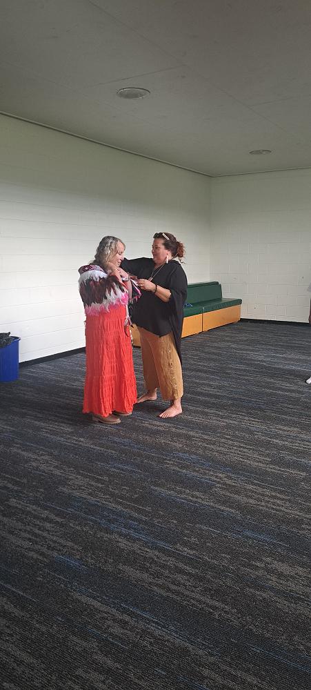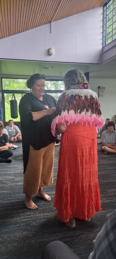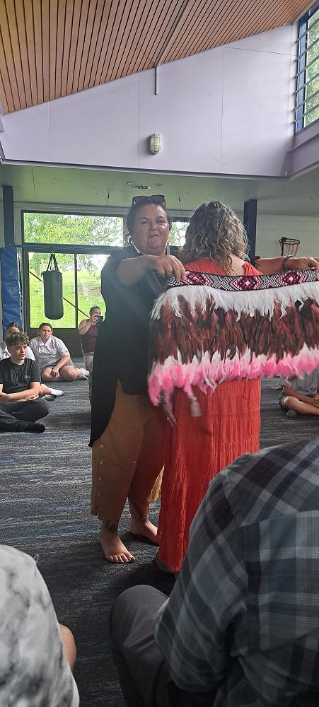 The Kapa Haka group honored Mrs. Quinney with a heartfelt presentation, gifting her a tailor-made korowai and a beautifully crafted pounamu, both blessed by a Kaumātua. To further celebrate this special occasion, the group performed our school haka with pride and passion, showcasing their aroha and respect.