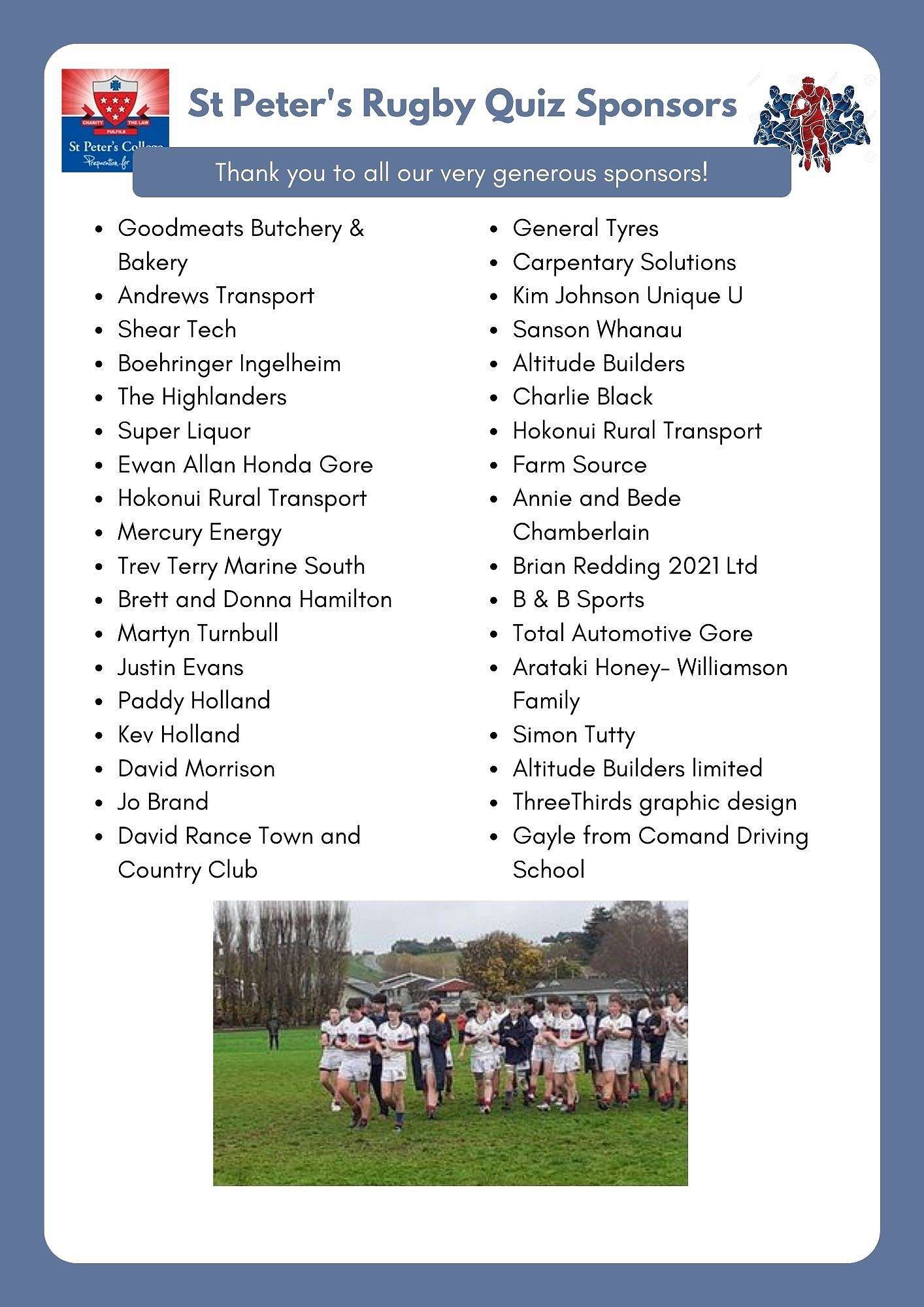 We feel privileged to be part of such a supportive and generous community – THANK YOU! The SPC Rugby Committee would like to acknowledge all of you who have assisted in this fundraising venture. Firstly, to our players & whānau – the raffles and supper plates were both amazing and delicious. Thanks for being taxi to your players and bringing a quiz team along. Thanks to our students who cleared, cleaned, helped with kai preparation and delivery, sold raffles and assisted us on the night. Thanks to our First XV muscles in the set up & packing up of the tables & chairs.