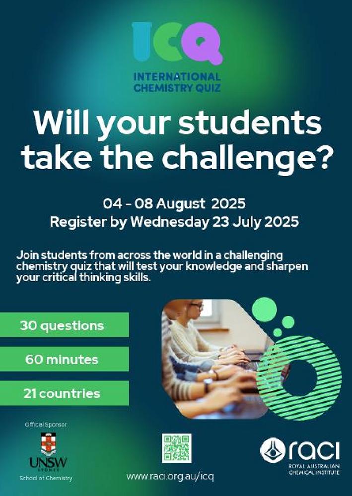 The International Chemistry Quiz is being held by the Royal Australian Chemistry Institute between the 4th and 8th of August. Entry is open to all students from Year 7 to 13, with 30 questions to be answered in one hour. It is an excellent opportunity for students to test their knowledge of chemistry, how it can be applied to real-world scenarios and see how they compare with students around the globe.